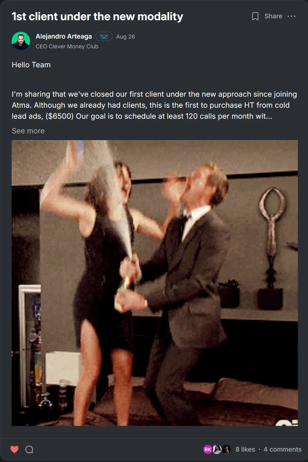 Before joining the program, Alejandro's business, Clever Money Club, which focuses on business funding for entrepreneurs, relied on a largely manual process. Although they used software for client onboarding (Dispute Fox), client communication and objection handling were manual and lacked a structured approach. Furthermore, he admitted to delegating Ads management without fully understanding the process, which he recognized as an operational mistake.